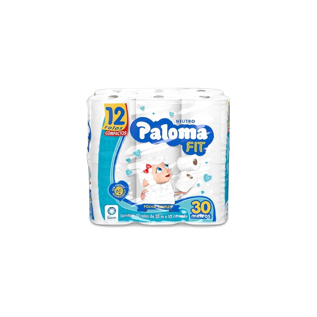 O Papel Higiênico Paloma Fit Neutro possui folha simples e excelente rendimento. Pacote com 12 rolos compactos de 30 metros cada, ideal para uso doméstico e revenda em mercados.